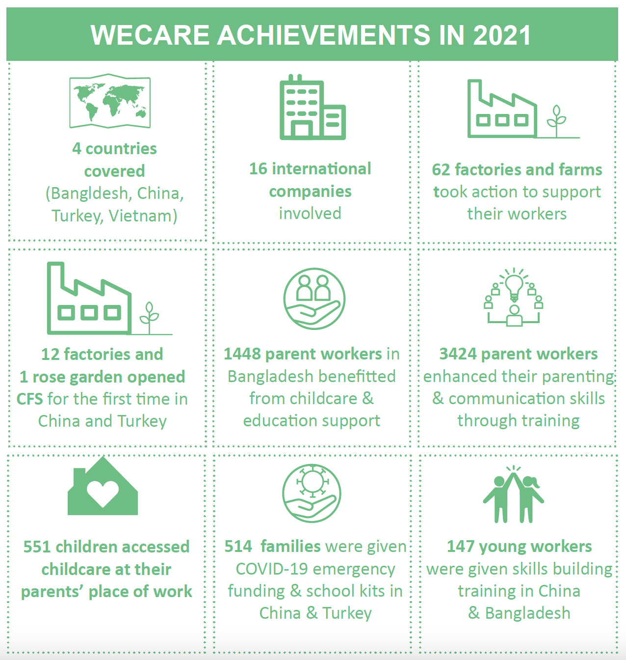 In 2021, The Centre implemented WeCare in four countries (Bangladesh, China, Turkey and Vietnam) delivering activities that not only benefited parent workers, children and young workers, but also created positive impact for all business partners involved.