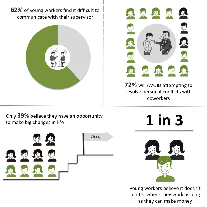 We believe that measuring and evaluating the impact of these trainings is crucial in ensuring the continued quality, relevance and impact of the trainings. In 2016, we concluded a pre- and post-training survey of six young worker training sessions conducted over the past few months across China. The survey allowed us to gain some insightful data into the attitudes and challenges perceived by young workers in China, as well as the impact of the trainings, as highlighted below.